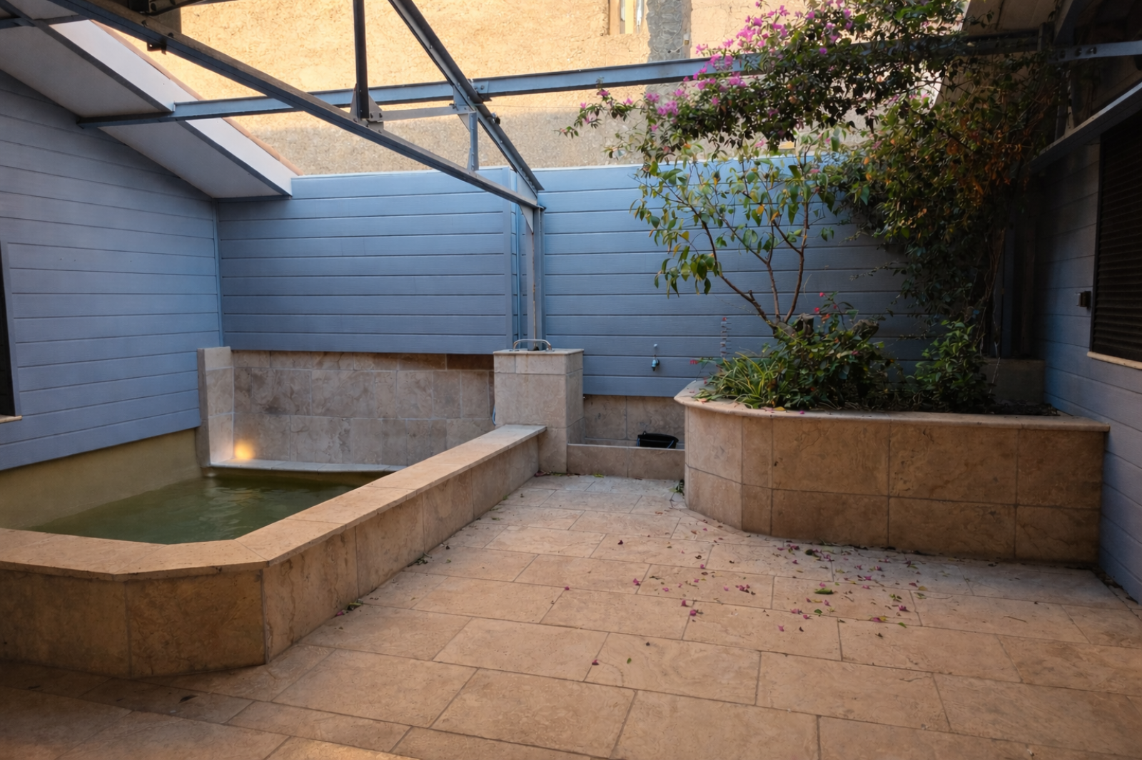 La charpente apparente en fer et le sol en travertin renforcent le cachet et l’authenticité de ce bien rare.