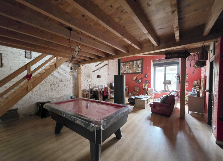 La pièce de vie, ouverte et conviviale, constitue le cœur de la maison, idéale pour recevoir ou profiter de moments en famille. Les matériaux et finitions apportent une touche industrielle élégante, typique du style loft.