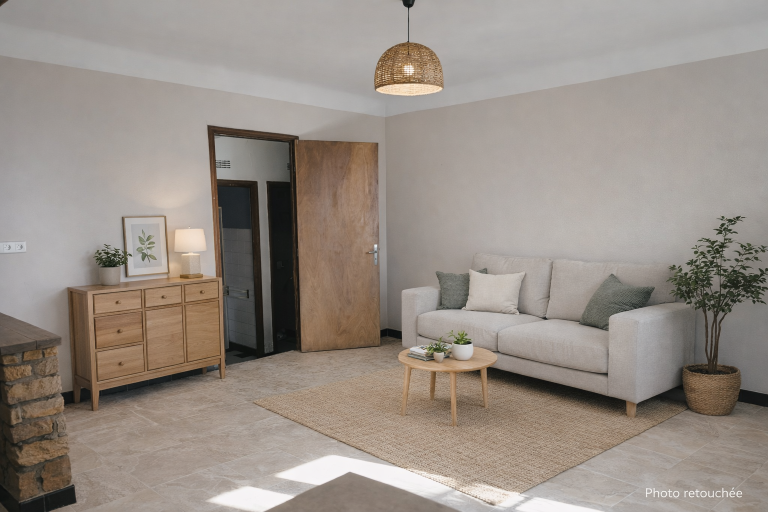 L’entrée s’effectue par une pièce de vie lumineuse d’environ 30 m², intégrant une cuisine ouverte, constituant un espace central agréable et convivial.
